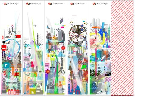 . Promotional set of illustrated bookmarks featuring the company's international offices and outposts. First of three: fronts of the five bookmarks and pad-backing with the firm's slogan "foresight. strategy. innovation."